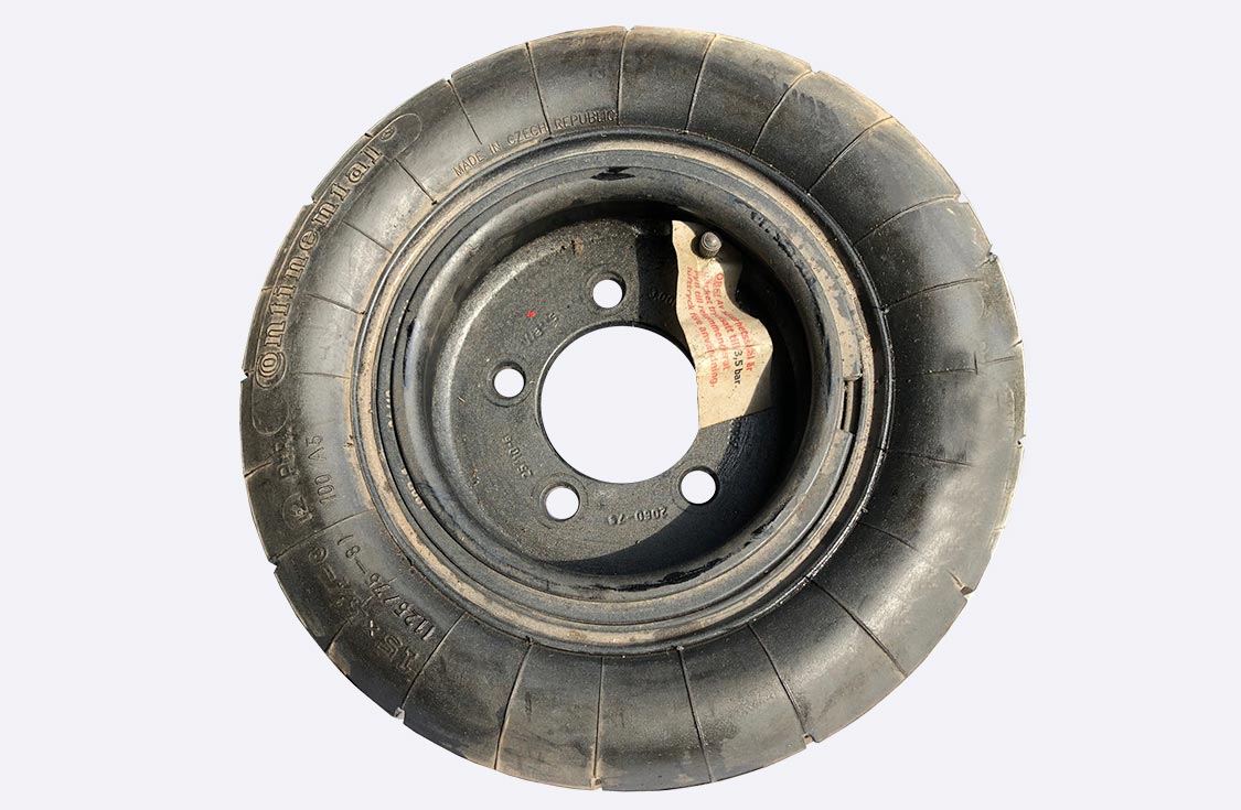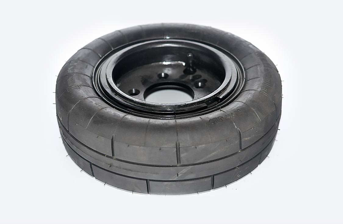 Replacement wheel and tire complete (no hub) including flat-proofing fill.